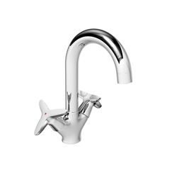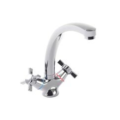 Надёжный двуручный смеситель для кухни из латуни с хромированным покрытием, устойчив к коррозии, прост в установке и эксплуатации.