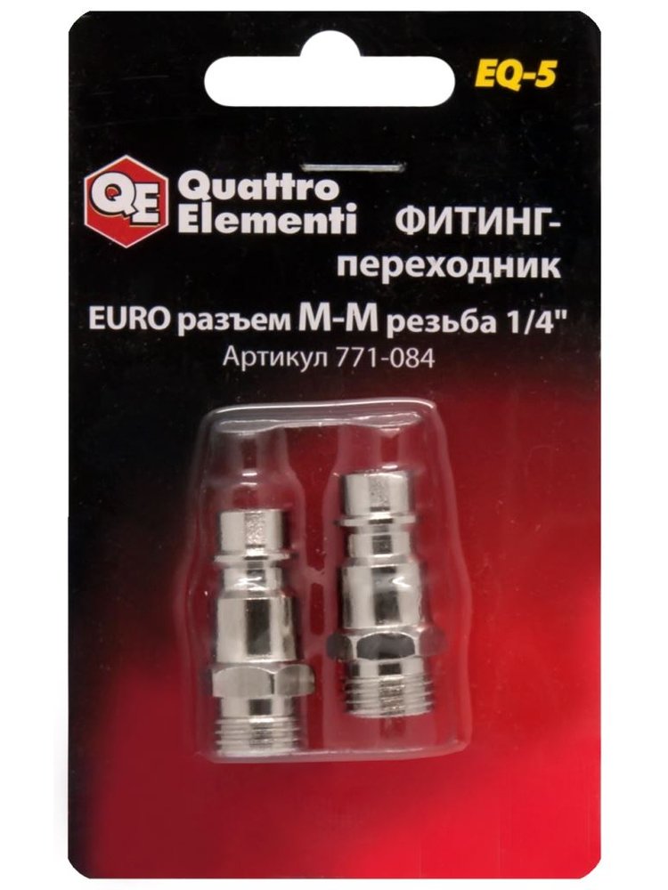 Фитинг-переходник EQ-5 Quattro Elementi - комплект из 2-х принадлежностей для компрессорного оборудования. Фитинги необходимы для подключения шланга к компрессору. Имеют стандартное соединение папа EURO и резьбу папа 1/4". Изготовлены из высококачественной стали, обеспечивают надежное крепление. Переходник евро-стандарт, резьба 1/4 дюйма, набор 2 шт., прочная латунь, для быстрого и надежного соединения пневмоинструмента.