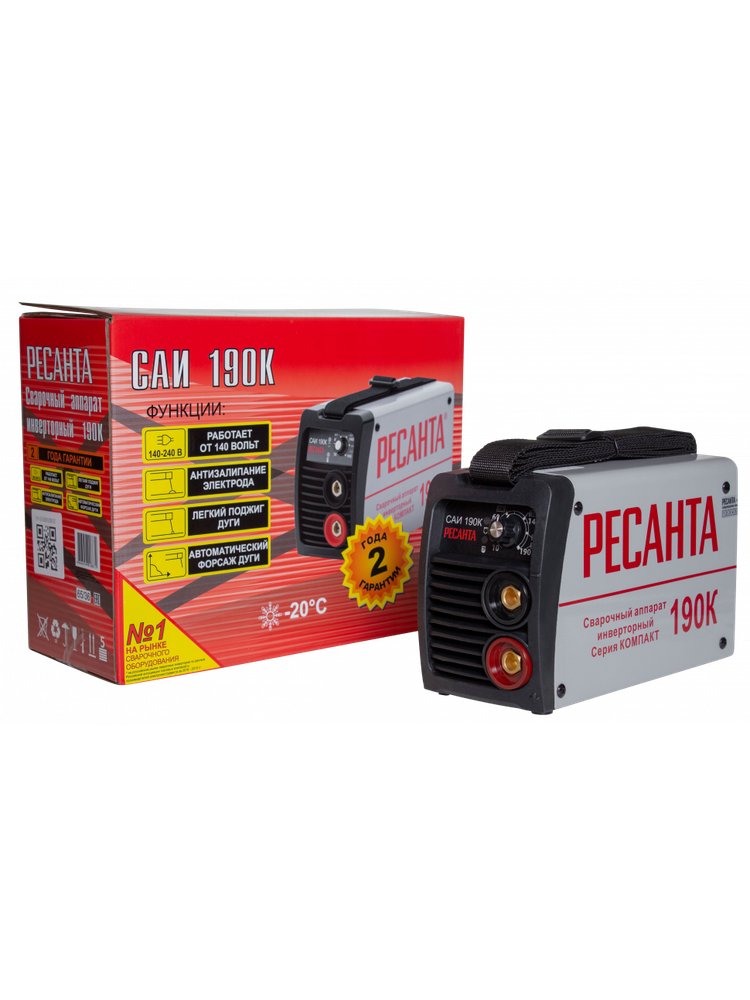 Сварочный инвертор Ресанта 190К – источник постоянного тока, разработанный для ручной электродуговой сварки электродами с твёрдым покрытием (метод MMA). Серия предназначена для работ на пониженном напряжении, где нет стабильного энергоснабжения (сети с частыми перепадами, диапазоном от 140 до 240В). Ресанта САИ 190К - самый компактный аппарат в линейке, позволяющий варить сложные металлоконструкции на особо трудных участках (высотные работы, системные трубопроводы). Максимальный рабочий ток – 190 А. Это позволяет создавать качественный сварной шов, даже при сваривании стальных заготовок, толщиной до 14 мм. Сварочный аппарат Ресанта 190К имеет три важных опции: Hot Start (Горячий старт). Эта функция обеспечивает быстрое прогревание электрода (за счёт импульсивного повышения тока). Anti Stick (опция «Антизалипания»). Понижение рабочих параметров при окончании сваривания. Эта особенность важна для предотвращения дефектов шва, удобного осуществления дальнейшего процесса. Arc Force (Форсир Мобильный и мощный инвер