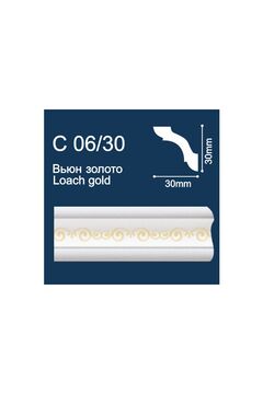 Потолочный плинтус 2 м, 30x30 мм, белый с золотым узором, лёгкий и прочный, простота монтажа, идеален для декора и скрытия стыков.