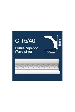 Потолочный плинтус с серебристым декором, устойчив к влаге и повреждениям, легко устанавливается, подходит для отделки жилых и офисных помещений.