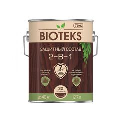 Для деревянных поверхностей из брёвен, вагонки, бруса, строганных и пиленых дощатых фасадов, термообработанной и пропитанной под давлением древесины снаружи помещений.Расход 12 - 17 м2/л по строганой и бревенчатой поверхности древесины; 7 - 9 м2/л по пилёной поверхности древесины. Разбавитель - Уайт-спирит. Время высыхания до отлипа – 1 час, следующий слой можно наносить через – 2 часа, полное – не более 24 часов Глубоко проникающий антисептик для дерева, защищает до 10 лет, оттенок махагон, объем 2,7 л, для наружных и внутренних работ.