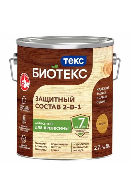 Для деревянных поверхностей из брёвен, вагонки, бруса, строганных и пиленых дощатых фасадов, термообработанной и пропитанной под давлением древесины снаружи помещений.Расход 12 - 17 м2/л по строганой и бревенчатой поверхности древесины; 7 - 9 м2/л по пилёной поверхности древесины. Разбавитель - Уайт-спирит. Время высыхания до отлипа – 1 час, следующий слой можно наносить через – 2 часа, полное – не более 24 часов Антисептик для дерева, защищает от влаги, плесени и УФ, яркий цвет «Орегон», объём 2,7 л, подходит для фасадов, заборов, садовых построек.