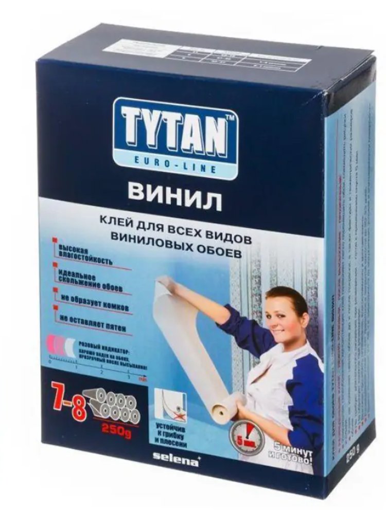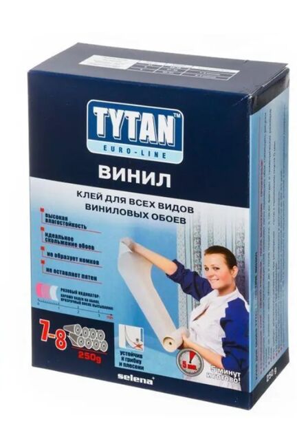 Tytan Euro-Line Винил - рекомендуется для всех видов виниловых обоев: стандартных и под окраску, легких и тяжелых, плоских, плотных, вспененных, структурных, рельефных, на флизелиновой основе, а также специальных (текстильных, шелкографии) и бумажных обоев. Клей изготовлен на основе модифицированных крахмалов европейского производства, антисептических и противогрибковых добавок и цветоиндикатора. Надежно фиксирует виниловые обои, быстро готовится, экономичен, предотвращает образование пузырей и плесени, подходит для любых поверхностей.