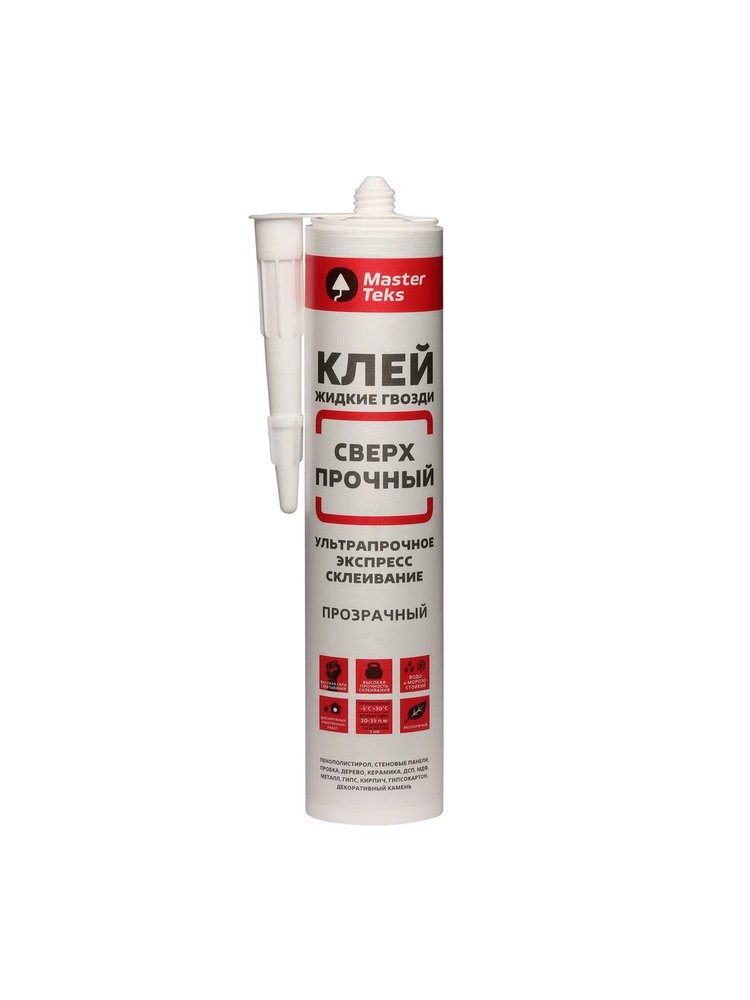 Клей полимерный Masterteks наносится на стены, предназначен для крепления конструкций. Для этого следует использовать специальный пистолет. Средство имеет полимерную основу, которая обладает высокой силой схватывания и обеспечивает усиленную прочность клеевого соединения. Состав можно применять для монтажа многих материалов — это могут быть стеновые и потолочные панели из дерева, пробки, фанеры, металла, гипса и т. д. Перед нанесением основание должен быть сухим, выровненным и чистым — нужно удалить всю пыль, масло и грязь. Особенности: устойчивость к вибрациям; для полного высыхания требуется 48 часов; образует эластичный шов; водо- и морозостойкость; применять при температуре от -10°C до +30°C; подходит для внутренних и наружных работ. Прозрачный сверхпрочный клей 260 г для работы с деревом, пластиком, металлом и керамикой. Быстро схватывается, влагостойкий, без запаха.
