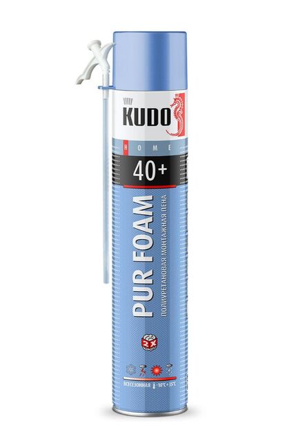 Для установки оконных и дверных блоков, подоконников, крепления стеновых панелей, герметизации щелей, пустот, тепло- и шумоизоляции швов, а также для других строительных и отделочных работ. Высококачественная однокомпонентная полиуретановая всесезонная монтажная пена KUDO HOME 40+ обладает высокой адгезией к большинству строительных материалов, таких как: бетон, кирпич, штукатурка, дерево, пластик, за исключением полиэтилена, полипропилена и фторопласта. Обеспечивает равномерный, стабильный выход и идеальную мелкопористую структуру готовой пены. Обеспечивает превосходную термо- и звукоизоляцию. Выход пены – до 40 литров gри температуре +23°С и относительной влажности 50% Универсальная всесезонная монтажная пена 1000 мл, высокая адгезия и выход до 40 л. Подходит для монтажа и утепления при -10°C…+35°C.