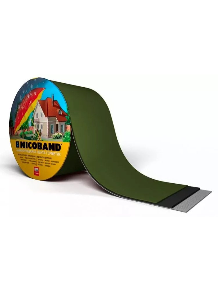 Самоклеющаяся лента марки NICOBAND предназначена для герметизации швов и трещин. Материал представляет собой трёхслойное изделие. Верхний слой – цветное покрытие с УФ-защитой. Средний представляет собой самоклеющийся герметизирующий материал. Нижняя часть – защитная пленка, которая легко отсоединяется. Лента Никобенд нашла широкое применение: материал используют для ремонта кровли, изоляции примыканий и водосточных систем. Изделие отличается хорошим сцеплением с различными материалами, включая древесину, стекло, пластик и бетон. Самоклеящаяся лента 10м×15см, герметичная, устойчивая к влаге и УФ, легко монтируется, подходит для кровли, окон, труб, защищает надолго.