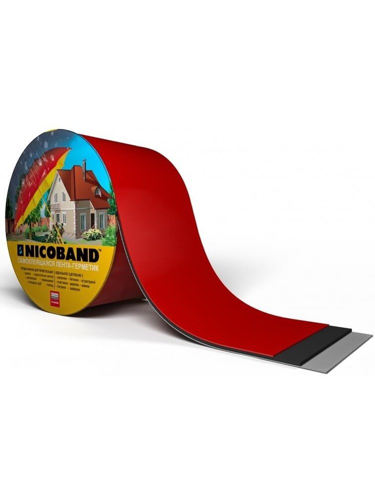 Самоклеющаяся лента марки NICOBAND предназначена для герметизации швов и трещин. Материал представляет собой трёхслойное изделие. Верхний слой – цветное покрытие с УФ-защитой. Средний представляет собой самоклеющийся герметизирующий материал. Нижняя часть – защитная пленка, которая легко отсоединяется. Лента Никобенд нашла широкое применение: материал используют для ремонта кровли, изоляции примыканий и водосточных систем. Изделие отличается хорошим сцеплением с различными материалами, включая древесину, стекло, пластик и бетон. Универсальная герметизирующая лента 10м×15см: водостойкая, устойчива к УФ, легко клеится, подходит для наружных и внутренних работ.