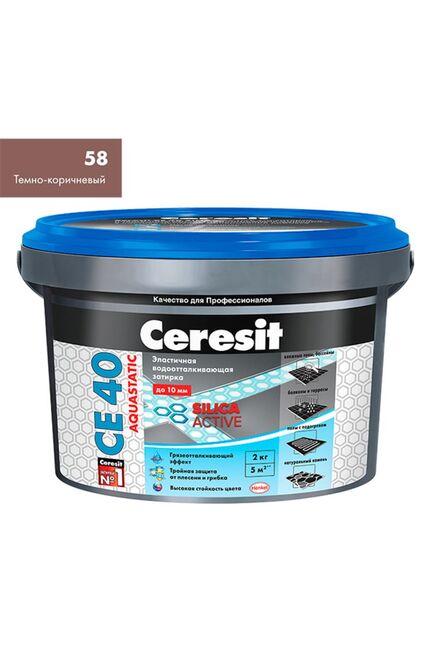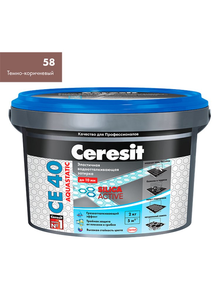 Надёжная затирка для швов Ceresit CE40 аквастатик 2 кг (тёмно-коричневая 58) обеспечивает элегантный внешний вид плиточного покрытия и защиту от влаги. Идеально подходит для ванных комнат, кухонь, душевых и балконов: формула на основе технологии аквастатик препятствует впитыванию воды и образованию плесени.