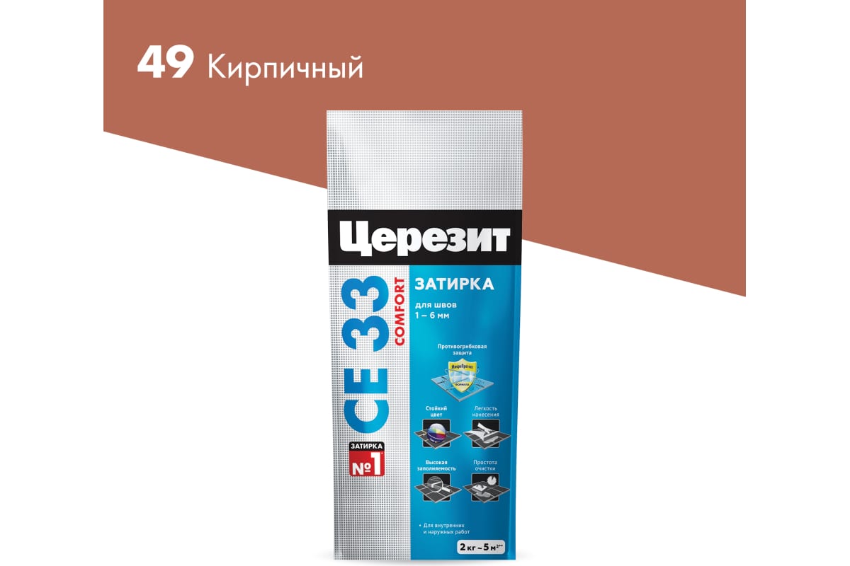 Смесь цемента с минеральными заполнителями, пигментами и полимерными модификаторами. Предназначена для заполнения швов керамических, стеклянных и каменных облицовок на полах и стенах в гражданском и промышленном строительстве. Применяется на недеформирующихся основаниях-бетон, цементно-песчаных, цементно-известковых и т.п., в т.ч. в небольших крытых резервуарах и бассейнах. Обладает противогрибковым действием и применяется для заполнения швов облицовок, эксплуатирующихся в условиях периодического увлажнения (в ванных комнатах, душевых, кухнях и.т.п.) Применяется при внутренних и наружных работах. Влагостойкая затирка цвет "кирпичный 49", 2 кг. Для швов шириной 1-6 мм, устойчива к плесени, простая в применении и обеспечивает долговечный результат.