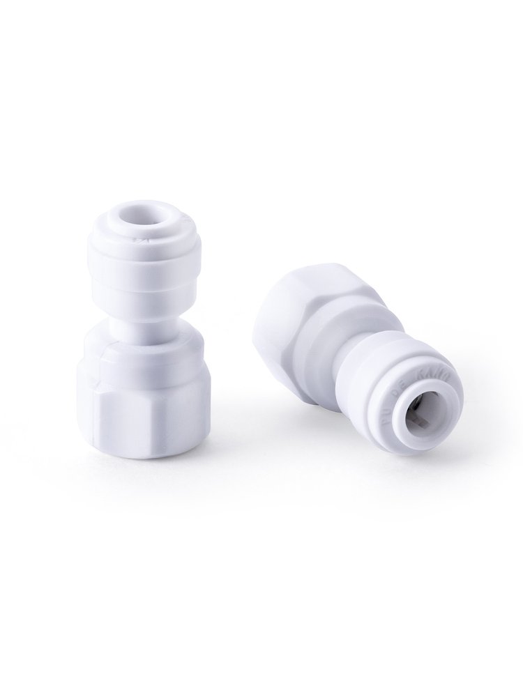 Фитинг с внутренней резьбой для соединения фильтра и крана для питьевой воды. Дает возможность соединить отрезки пластиковых коннекторов и трубок разных диаметров и надежно зафиксировать их. Деталь изготовлена из пищевого пластика. Быстросъемный фитинг для соединения фильтра и крана, прочный пластик, 7/16"-1/4QF, прост в установке, не допускает протечек.