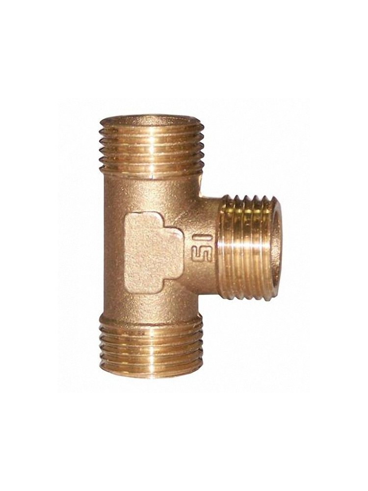Тройник из никелированной латуни, диаметр 15 мм, наружная резьба, устойчив к коррозии, для воды, отопления и ГВС, простой и герметичный монтаж.