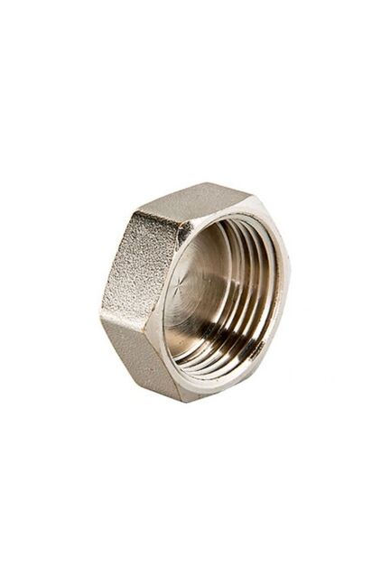 Герметичная латунная заглушка Ду 15 с внутренней резьбой, никелированное покрытие, надёжная защита труб от протечек и коррозии.