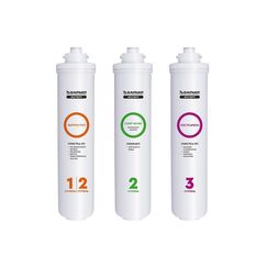 Комплект сменных модулей глубокой очистки. Оптимален для мягкой воды. В условиях жесткой воды он полностью выполняет функцию глубокой очистки от вредных примесей, однако не снижает минерализацию. Поэтому, если при кипячении на нагревательных элементах образуется белый налет, рекомендуем рассмотреть специализированный комплект с умягчающим модулем для глубокой очистки воды. Эффективное решение для многоступенчатой очистки воды от механических примесей, хлора и запахов. Ресурс — до 6000 л, удобная замена.
