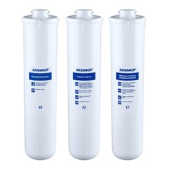 Комплект сменных модулей К3-К2-К7 предназначен для систем очистки воды Аквафор серии Кристалл. Пластиковая кассета обеспечивает глубокую очистку проточной воды из крана от хлора, тяжелых металлов, железа и других примесей, содержащихся в воде. Универсальный водяной хозяйственный модуль К3 создан для предварительной механической фильтрации воды. Он защищает от попадания крупных примесей и растворенных частиц ржавчины и железа. К2 - очищающая кассета с внутренней угольной мембраной для глубокой чистки. Удаляет хлор, органические примеси, тяжелые металлы, делая воду чистой. Модуль К7 - финишная очистка воды и ее кондиционирование. Содержит серебро в активной ионной форме. Фильтрация до 0.8 микрон. Ресурс 8000 литров, но не более 1.5 лет. Сменный комплект для глубокой очистки воды, устраняет хлор, запахи и примеси, ресурс до 8000 л, легко устанавливается, подходит для систем «Кристалл М».
