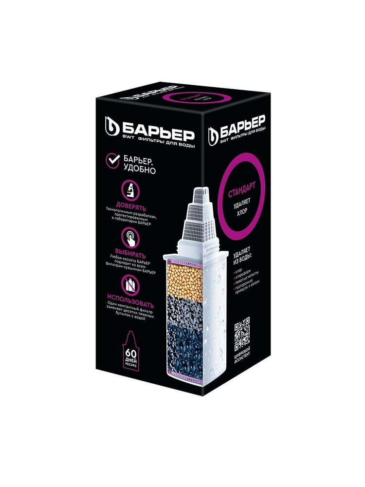 ысококачественная доочистка водопроводной воды от хлора, хлорорганики, тяжелых металлов, пестицидов, ПАВ и нефтепродуктов. Подходит для всех фильтров кувшинов БАРЬЕР. Универсальный картридж очищает до 350 л воды, устраняет хлор и тяжелые металлы, подходит для большинства фильтр-кувшинов, легкая замена.