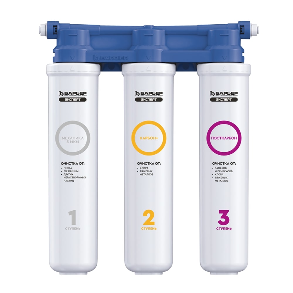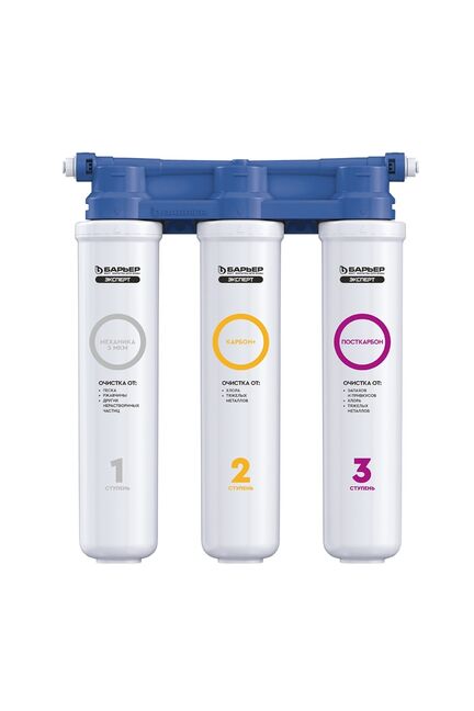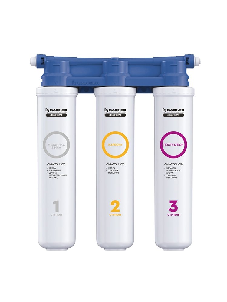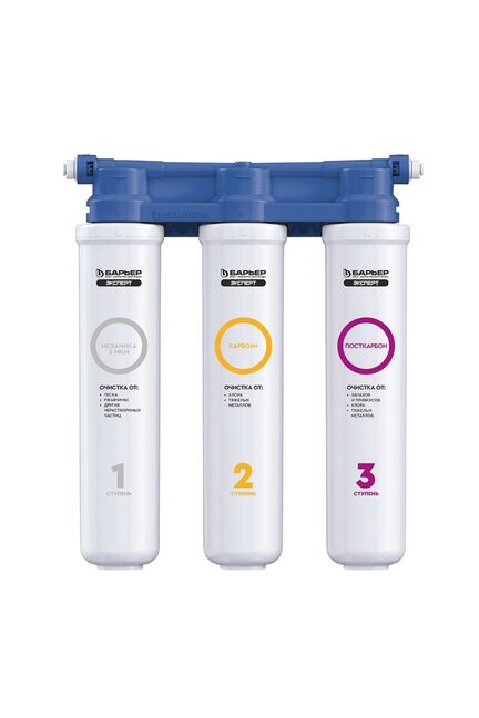 Компактный проточный фильтр для экономичной доочистки городской воды от хлора, тяжелых металлов и механических частиц. Улучшает вкусовые качества воды. Отличается от классической линейки ЭКСПЕРТ статичным положением картриджей. Благодаря конструкторским решениям блок фильтра ("голова") отливается целиком, что позволило сделать вашу любимую модель фильтров еще надежнее и доступнее по цене. Удобная конструкция поместится даже на небольшой кухне. Производительность - 2 л/мин. Ресурс - 8 000 литров. Вода проходит три этапа очистки: 1."БАРЬЕР ЭКСПЕРТ Механика" удаляет любые механические примеси до 5 мкм (песок, ржавчину и другие механические примеси). 2."БАРЬЕР ЭКСПЕРТ Карбон+" используется для эффективного удаления хлора и хлорорганических соединений. 3."БАРЬЕР ЭКСПЕРТ ПостКарбон" - финишная очистка и кондиционирование, устранение неприятных привкусов и остаточного хлора. Компактная система для глубокой очистки воды: удаляет хлор, примеси, умягчает, подходит для дома и дачи, лёгкая установка и обслуживание.